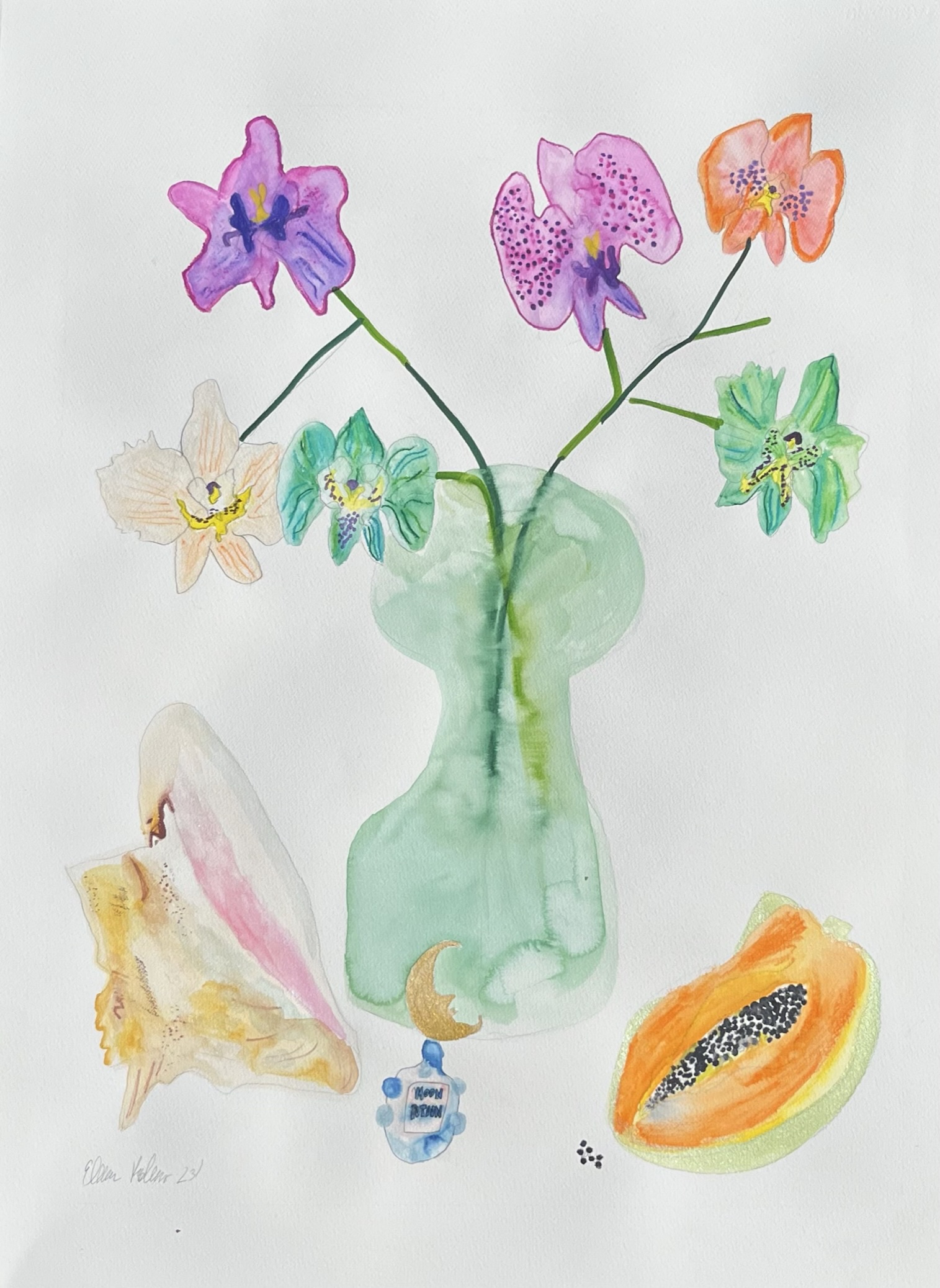 She started painting 2 years ago. Fascinated by objects, their symbology and relationship with memories, Elena likes painting still-lifes which she first constructs in real life to paint them afterwards . She believes objects can have special powers and therefore become a sort of “good-luck charm”. Fresh flowers, vintage food branding products, books, jewelry, perfumes, toys… among others are always a part of her compositions.